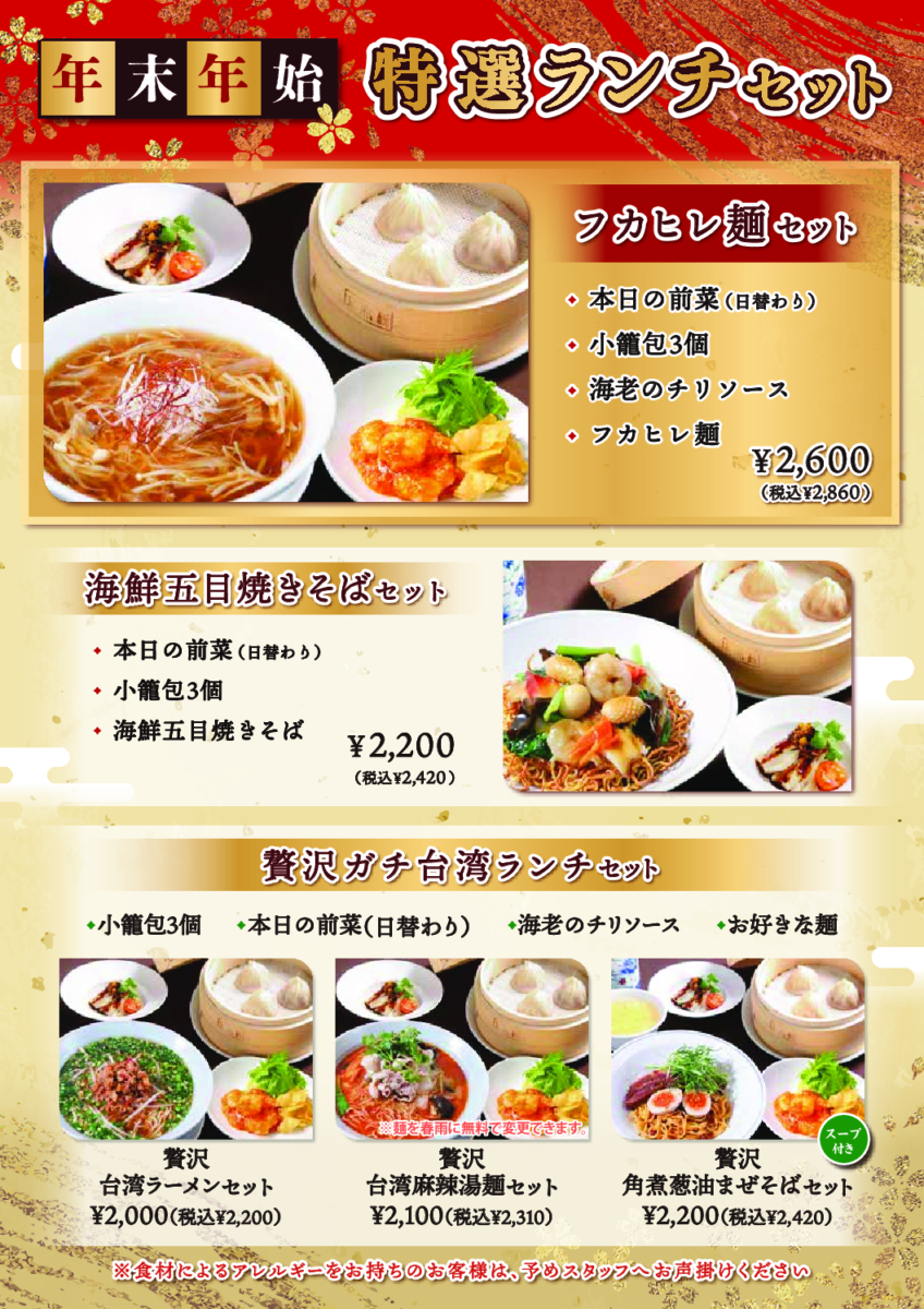 店舗詳細ご予約はこちら TOP 店舗検索 / メニュー 【枚方店】🎍✨年末年始限定メニューのご案内(12/27~1/4) 【枚方店】🎍✨年末年始限定メニューのご案内(12/27~1/4) 🎍✨年末年始 特選ランチセットのお知らせ✨🎍 いつもご利用いただきありがとうございます。 年末年始の特別営業に伴い、12月27日(土)~1月4日(日)の期間中は、 通常のランチメニューをお休みし、特選ランチセットをご提供いたします。 年末年始も京鼎樓で、心あたたまるひとときをお過ごしください。 皆さまのご来店を心よりお待ちしております♪ ※通常のランチメニューは1月5日(月)より再開いたします。 前の記事へ 一覧へ戻る 次の記事へ Official SNS お得な情報やキャンペーンを配信中! 20周年記念動画 公開中! 店舗詳細・ご予約はこちら エリアから探す ブランドから探す